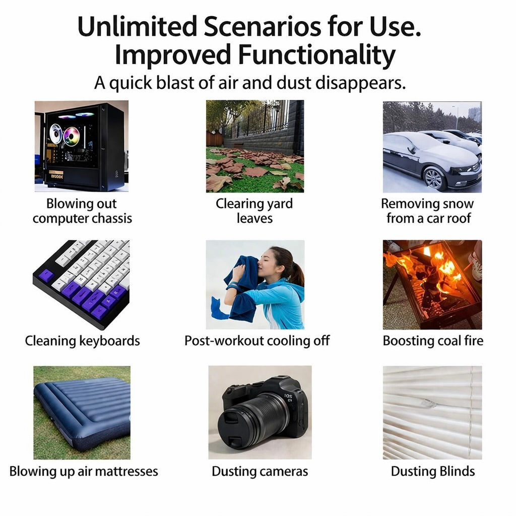 Perfect for cleaning keyboards, PCs, laptops, gaming setups, car interiors, cameras, vents, office equipment, and delicate electronics, this portable air blower helps you clean faster and more effectively at home, at work, or on the go.